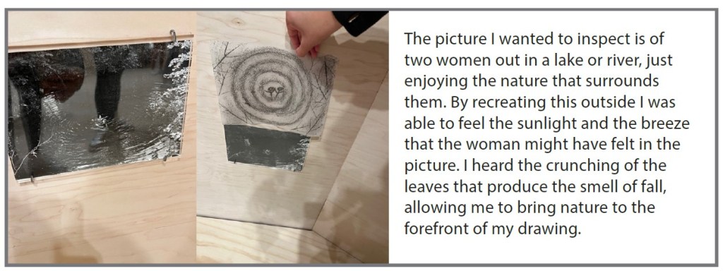 Return to the gallery, and the photograph your group choose to reflect on. Take a moment to share your sensory walk experiences with your group, and the rubbings (5 minutes). Create a short story or description of your photographic evidence in relation with your rubbing experience (10 minutes). What did you think about? How did the process make you feel? Choose from one of the body-brain ticklers for a prompt.. Return to the gallery to share your group experience with the class (15 minutes).