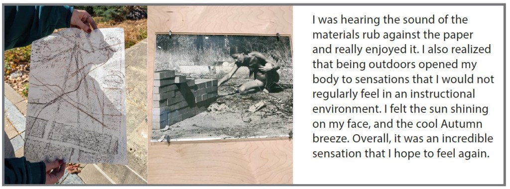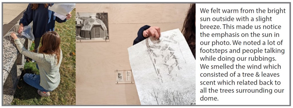 Through the activity of rubbing/remembrance students think through the lived experiences of the WomanShare Collective, rubbing against the surfaces of their environment in response to archived photographs. Students encounter the archive through rhythmic rubbing processes relational with peers, sensations and emotions. To remember in eco-poetic relations with non-human others, we approach an ecology of relations “beyond the page,” and “move to notice and imagine” (Kuppers, p. 11, 131, 2022). Our more-than-writing activity reveals collective poetic textures in solidarity with interdependent and vulnerable bodies.