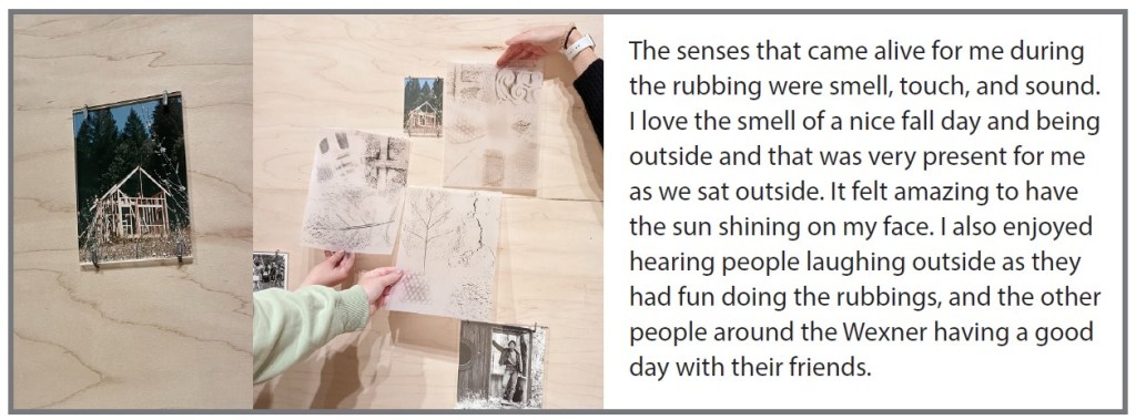 My activity, rubbing/remembrance, engages with a Wexner Center for the Arts exhibition of the WomanShare Collective archives to generate inclusive pedagogy for neurodiverse learners in solidarity with a feminist land-based movement. This activity was introduced during my GTA appointment in ARTEDU 2600 (15152) Visual Culture: Investigating Diversity & Social Justice, during spring semester of 2022.