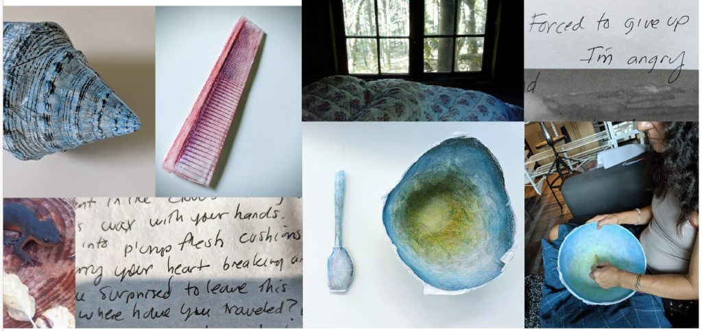 A digital collage of exchanged photographs, letters, and shaped rubbings made from objects and photographs shared between my sister and I while she lived on Women’s Land.