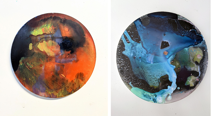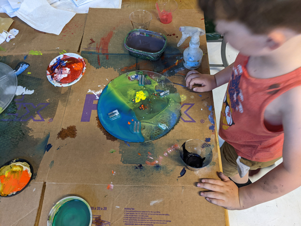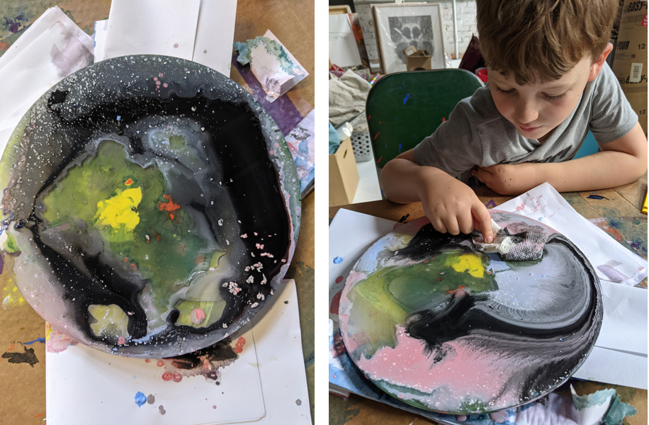 We sanded the clear acrylic on both sides, so the paint sticks to the surface. and we can see both painted sides simultaneously. Arlo picks out three colors and becomes immersed in the meditative swirls of color interaction. “What planet does this remind you of?” he asks.