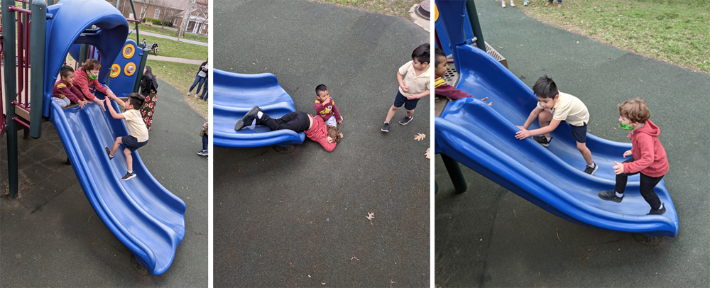 Let me just say, these are not the slides that I grew up. They are soft plastic which land you, shock-free, on squishy turf. The slides I played on yesteryear were metal and towered over the playground at heights that made us tremble. They boomed or popped as we slid down, and sometimes burned our thighs on hot summer days.