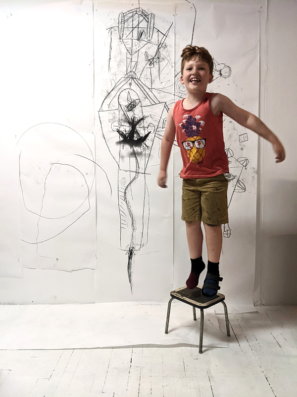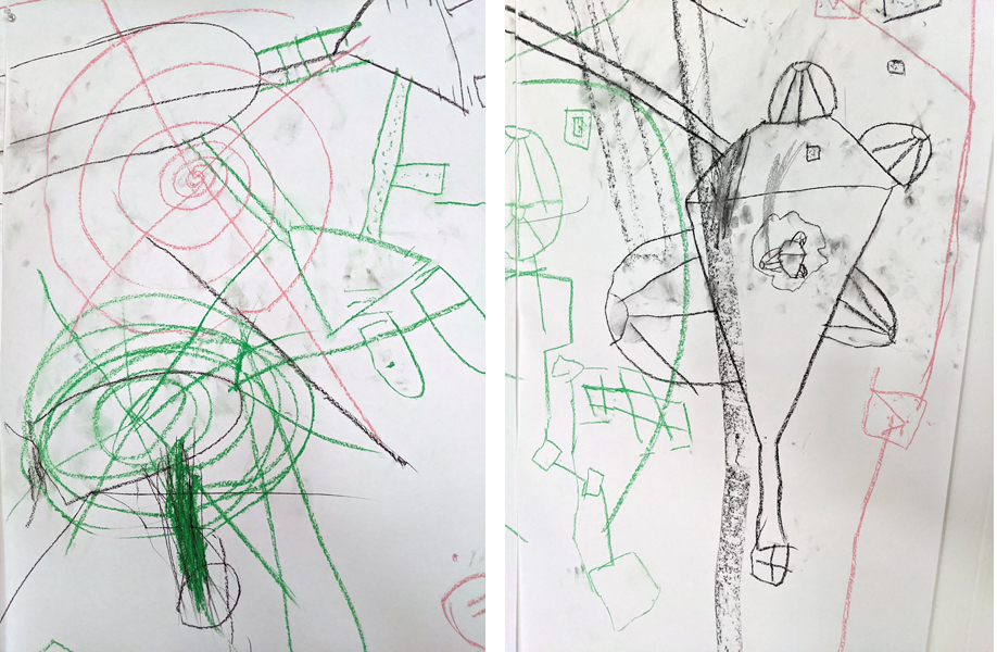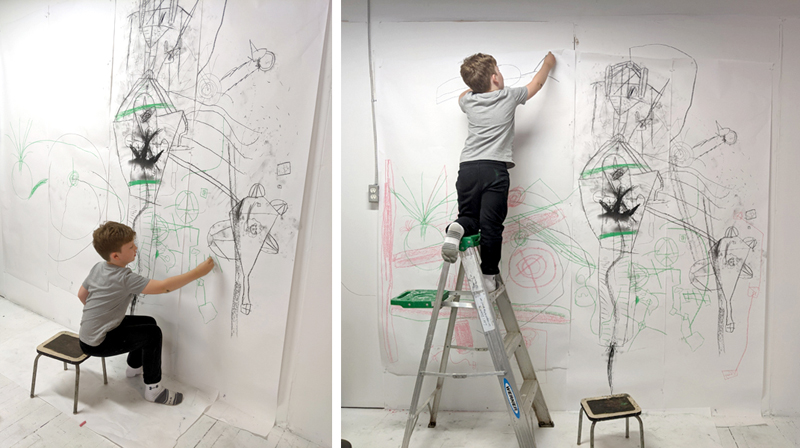 The white butcher paper roll is useful as both drawing surface and drop cloth. Arlo begins with a stick of black charcoal and eventually chooses two colors; pink and green. He uses color to show different layers of information in the drawing. Scale shift, or depictions of varying scales with repetition and overlap, gives me a fairly good idea of how large these forms are imagined to be.