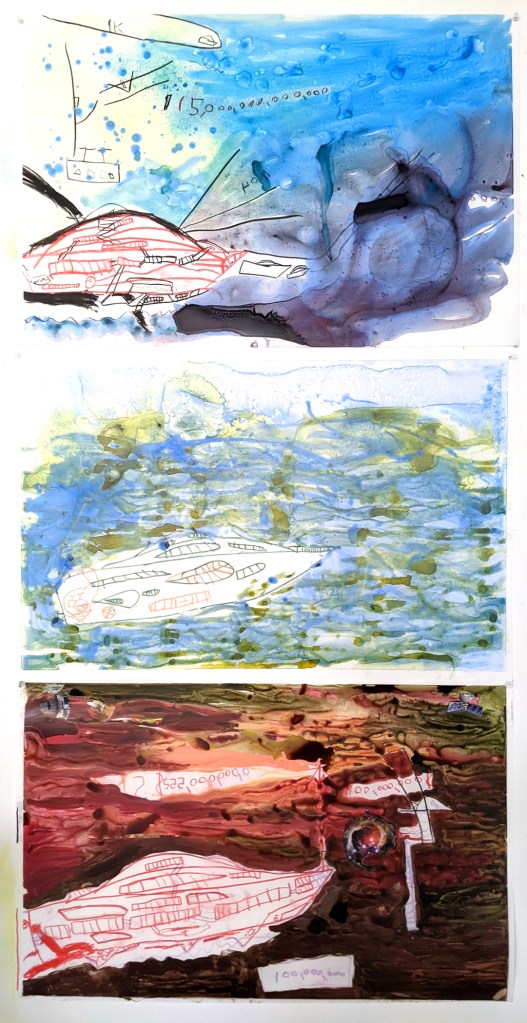 This large-scale marker drawing is being prepared for collective transformation through sea storms, shallow waters, racing currents, and perhaps collisions with icebergs. We are all too aware of the tropical storms that have been traveling through this part of the country, lately, so we listened to the sounds of sea storms to get in the zone.